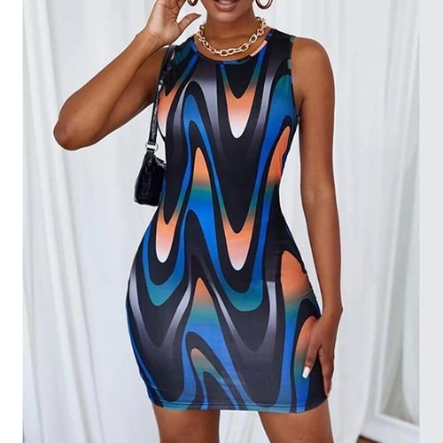 Fashion Robe Slim Imprimée Pour Femme - bleu